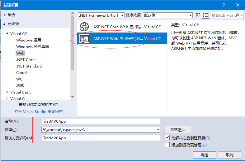 第4步 - 在名称字段中输入项目名称:firstmvcapp,然后单击 确定 以继续。将看到下面的对话框,要求您设置asp.net项目的初始内容。