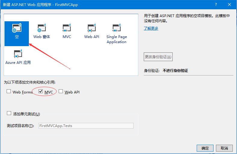 第5步 - 为了简单起见,请选择“空” 选项,并在“为以下项添加文件夹和核心引用” 部分中选中 “mvc” 复选框,点击 确定。