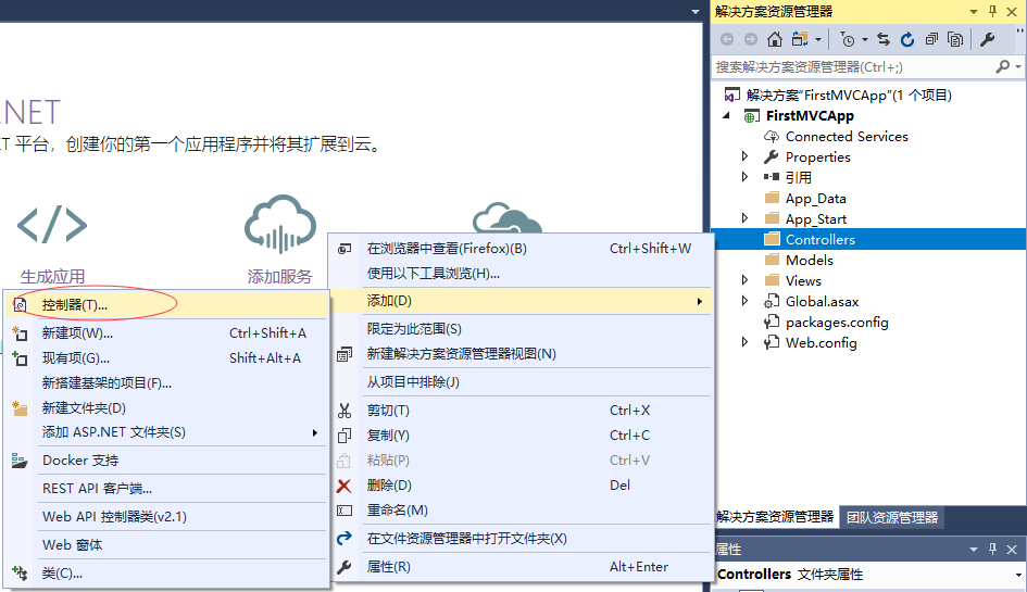 第1步 - 添加控制器,请右键单击项目:firstmvcapp 中的 controllers 文件夹,然后选择:添加 -> 控制器 。