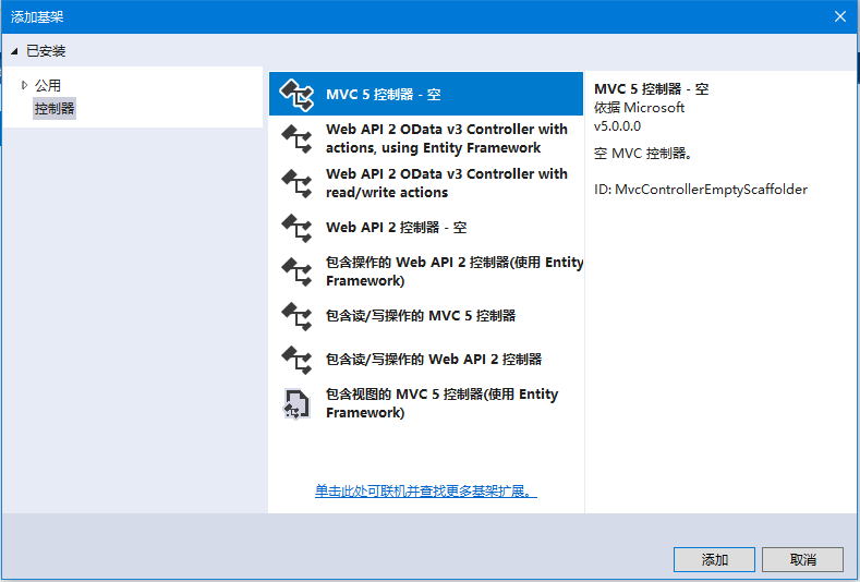 第2步 - 选择 mvc 5控制器 - 空 选项,然后单击“添加” 按钮。添加控制器对话框将出现。如下所示 -