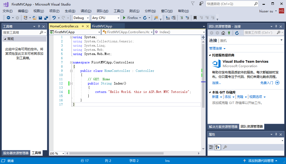 在controllers文件夹中看到一个新的 c# 文件:homecontroller.cs,该文件夹也在visual studio中打开并进行编辑。