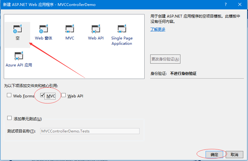 第5步 - 为了简单起见,选择空 选项,并在“为以下项添加文件夹和核心引用”部分选中mvc复选框,然后单击【确定】。