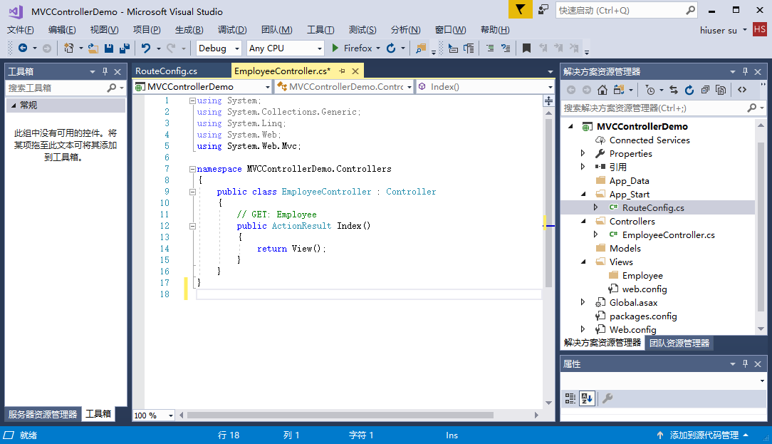 我们来看一个简单的控制器例子,通过创建一个新的asp.net mvc项目。