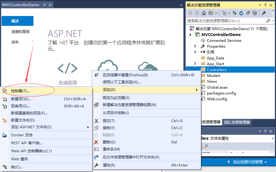 第1步 - 通过在解决方案资源管理器 中右键单击 controllers 文件夹来添加一个:控制器:customercontroller。选择:添加 -> 控制器 。如下所示 -