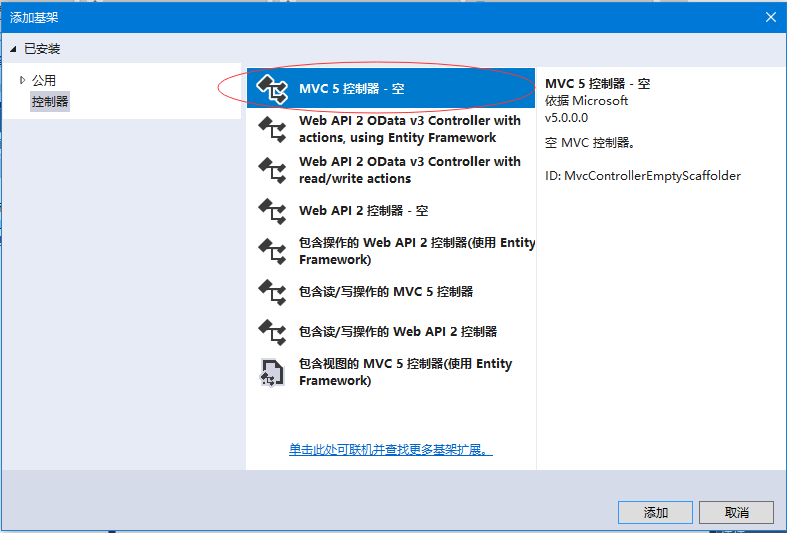 第2步 - 选择mvc 5控制器 - 空 选项,然后单击“添加” 按钮。添加控制器对话框将出现。