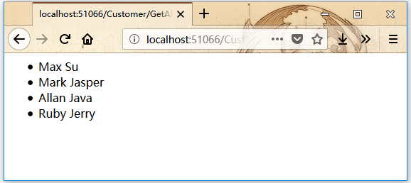 第6步 - 运行该应用程序并请求url: http://localhost:51066/customer/getallcustomers ,将看到以下输出 -
