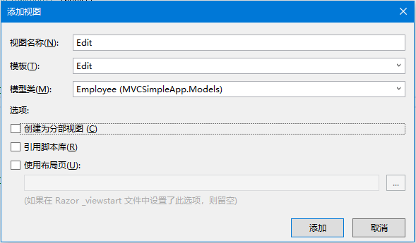 在actionlink助手中,第一个参数是“edit”链接,第二个参数是控制器中的动作方法,也是“edit”,第三个参数id是要编辑的员工编号。