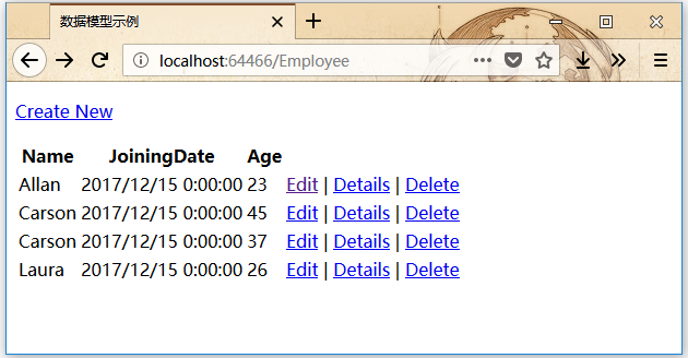 让我们运行这个应用程序,并请求以下url:http://localhost:64466/employee员工。将会看到以下输出。