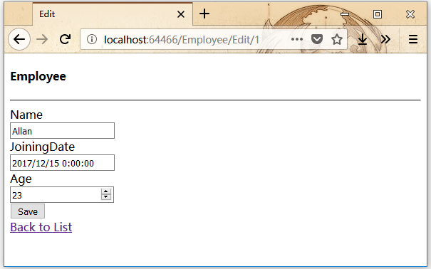 点击任何特定员工的编辑链接,以点击员工编号为1编辑链接为示例,您将看到以下视图显示结果。