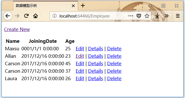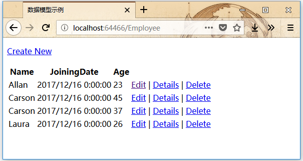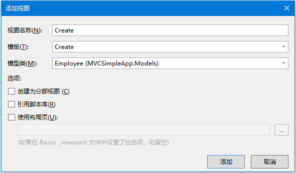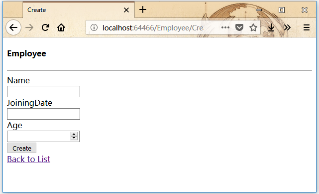 我们来看一个简单的例子,在上一章的项目中添加一个“创建视图”,我们将看到如何从视图中获取这些值传到employeecontroller动作方法。