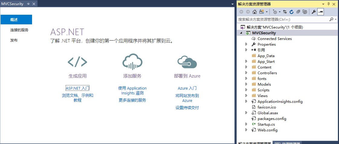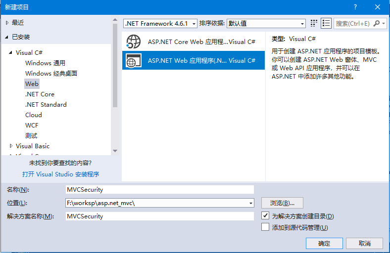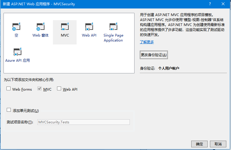 我们来创建一个新的asp.net mvc应用程序项目:mvcsecurity 。点击确定 继续。