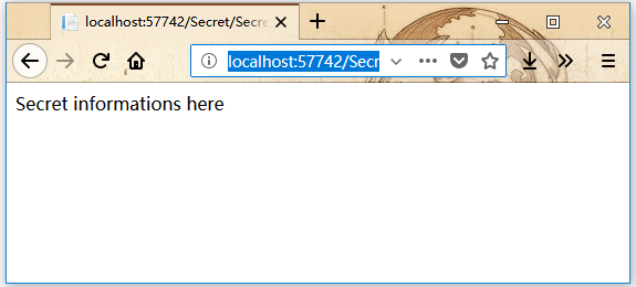 当运行这个应用程序时,可以在没有任何验证的情况下访问这个信息(url:http://localhost:57742/secret/secret),如下面的截图所示。