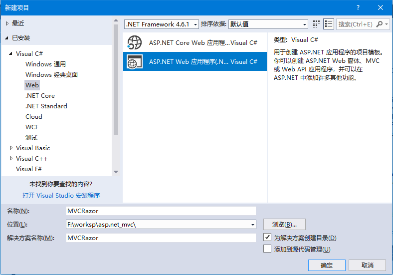 在名称字段中输入项目的名称:mvcrazor,然后单击确定。如下图所示 -