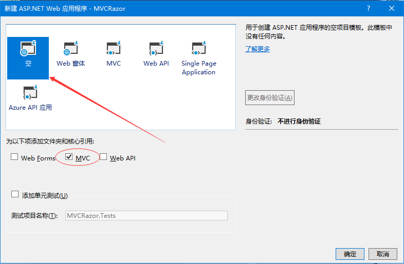 为了简单起见,选择 空 选项并在为以下项添加文件夹和核心引用 部分选中mvc复选框,然后单击确定。 它将使用最少的预定义内容创建一个基本的mvc项目。