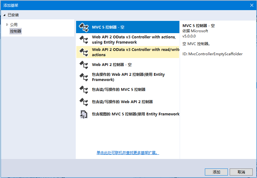 选择mvc 5控制器 - 空 选项,然后单击添加 按钮,然后添加控制器对话框将出现。