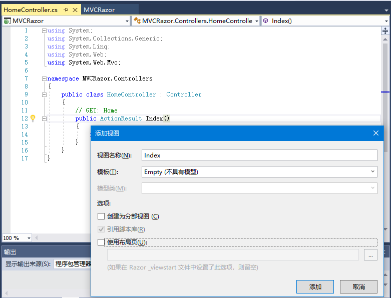 右键单击index操作方法,然后选择添加视图… ,如下所示 -