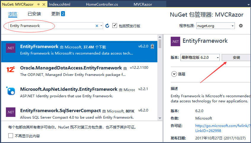 第2步 - 在搜索框中搜索实体框架 - entity framework ,结果如下-