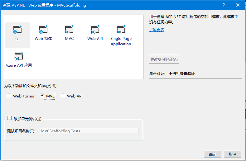 将看到下面的对话框,要求设置asp.net项目的初始内容。