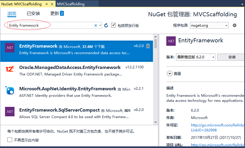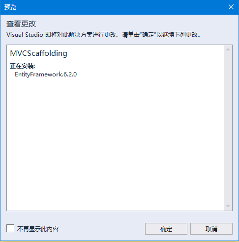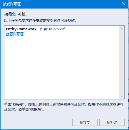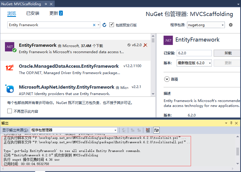 当实体框架安装成功后,可看到如上面的截图所示的出窗口的消息。