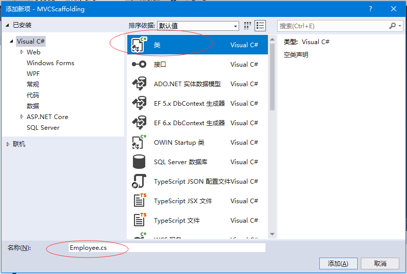 在中间平移中选择:类,并在名称字段中输入:employee.cs。如下图所示 -