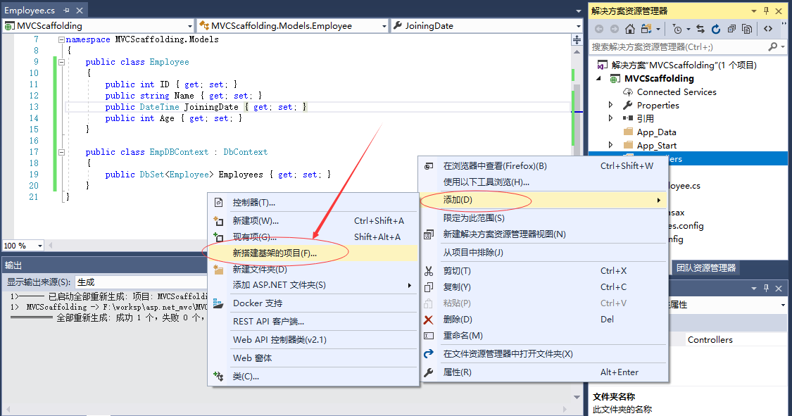 要添加脚手架,请右键单击解决方案管理器中的controllers文件夹,然后选择:添加 -> 新建搭建基架项目 ,如下图所示 -