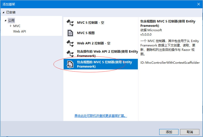 选择:包含视图mvc 5控制器(使用entity framework) 项,然后单击“添加” 按钮,这将显示添加控制器对话框。