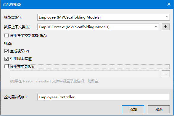 从模型类 下拉列表中选择:employee,并从数据上下文类 下拉列表中选择empdbcontext。还将看到默认情况下选择了控制器名称。