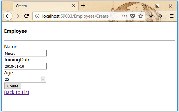 我们来看一个简单的例子。它创建一个包含模型类 -employee的相同示例,但是这次将使用脚手架。