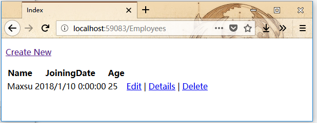 点击“创建”按钮,它将更新index 视图,看到有一条记录。如下所示-