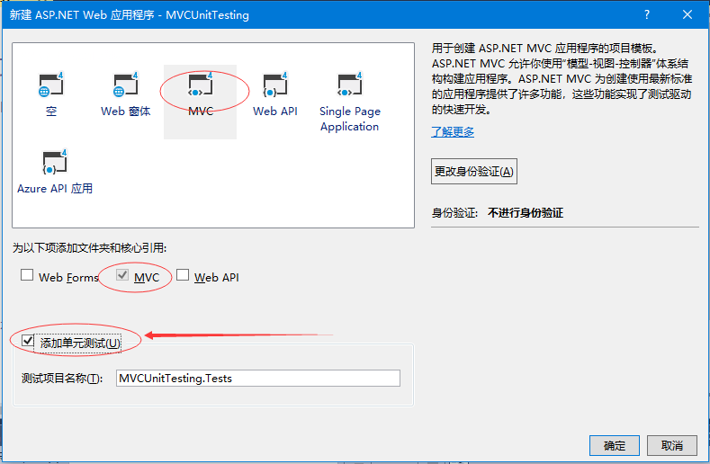 第5步 - 选择mvc作为模板,不要忘记选中对话框底部的添加单元测试复选框。也可以更改测试项目名称,但在此示例中,我们将其保持原样,因为它是默认名称。