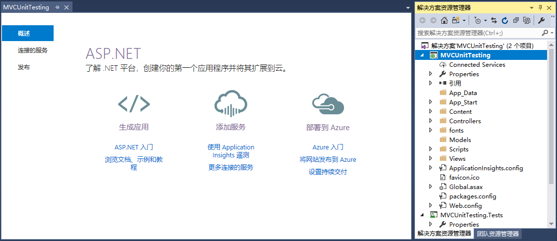 第6步 - 可以看到在解决方案资源管理器中有两个项目。 一个是asp.net web项目,另一个是单元测试项目。