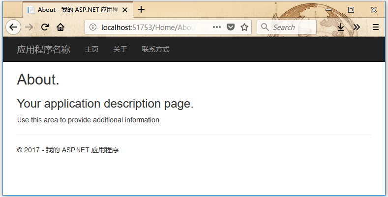 如上图所示,导航栏上有“首页”,“关于”和“联系人”按钮。这里点击“关于”链接,会看到下面的视图。