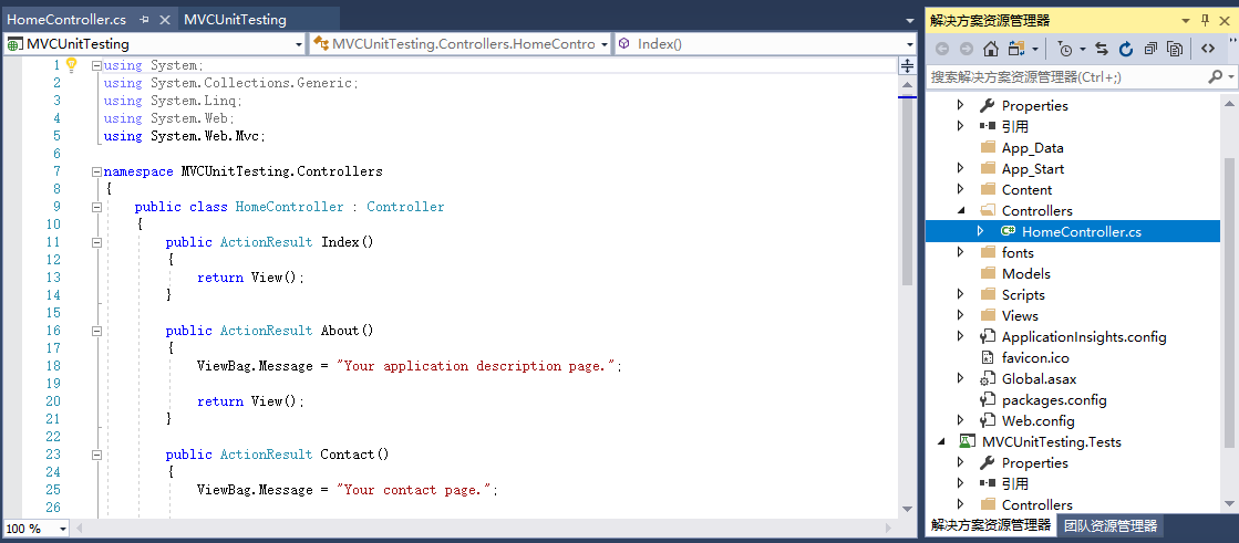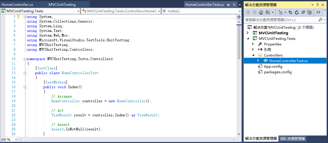 展开mvcunittestingdemo.tests 项目,controllers文件夹下的homecontrollertest.cs文件。