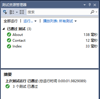 这三个方法将测试index,about和contact操作方法是否正常工作。要测试这三个操作方法,请转到测试 菜单。选择:运行 -> 所有测试 项来测试这些操作方法。
