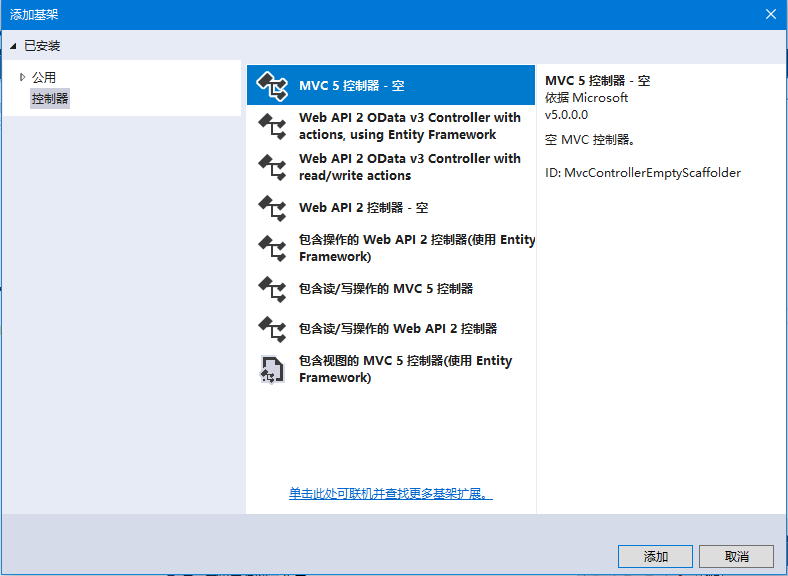 添加employeecontroller 。 右键单击解决方案资源管理器 中的controllers 文件夹,然后选择:添加 -> 控制器 ,它将显示“添加基架”对话框。选择:mvc 5控制器 - 空 选项,然后点击“添加” 按钮,如下图所示 -