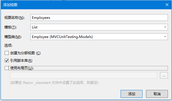 添加控制器对话框将出现。将名称设置为:employeecontroller,然后单击“添加”按钮。