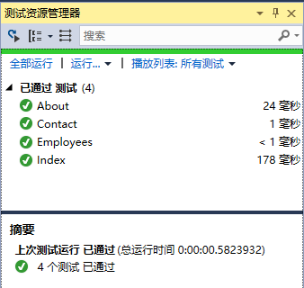 现在会看到左边的测试资源管理器,可以看到所有的测试都通过了。再添加一个动作方法,它用于列出所有的员工。首先,需要在models 文件夹中添加一个employee类。