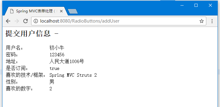 第二个服务方法adduser()将根据url => radiobuttons/adduser 上的post方法请求时调用。根据提交的信息准备模型对象。 最后从服务方法返回“userlist”视图,这将呈现userlist.jsp视图。