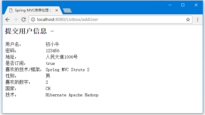 提交所需信息后,点击提交按钮提交表单。 如果spring web应用程序没有问题,应该看到以下结果: