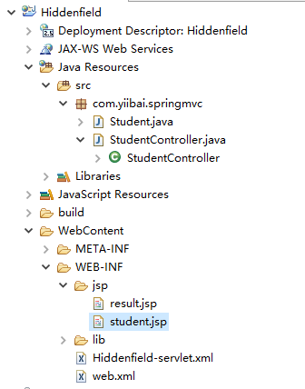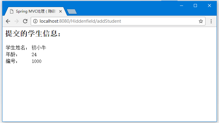 第二个服务方法addstudent()将根据url => hiddenfield/addstudent 上的post方法请求时调用。根据提交的信息准备模型对象。 最后从服务方法返回“result”视图,这将呈现result.jsp视图。