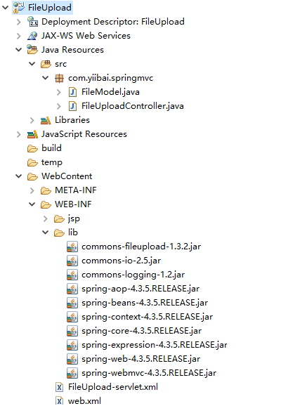 com.h3.springmvc 包下创建两个java类filemodel, fileuploadcontroller。jsp子文件夹下创建两个视图文件:fileupload.jsp 和 success.jsp。webcontent文件夹下创建一个文件夹:temp。classpath中。完整的项目文件目录结构如下所示 -