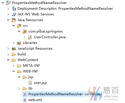 propertiesmethodnameresolver-servlet.xml 的代码如下所示 -