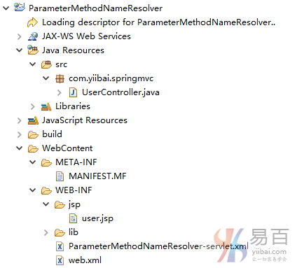 com.h3.springmvc 包下创建一个java类usercontroller。jsp子文件夹下创建一个视图文件:user.jsp。完整的项目文件目录结构如下所示 -