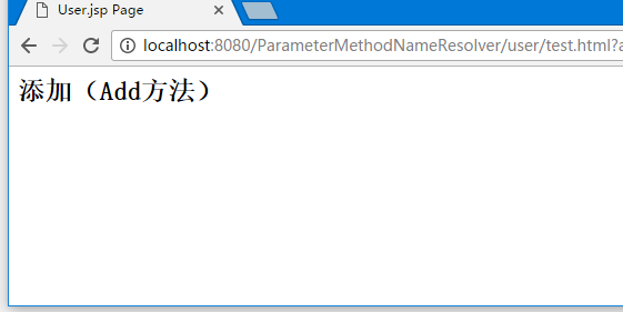 现在启动tomcat服务器,当访问url => http://localhost:8080/parametermethodnameresolver/user/test.html?action=add , 如果spring web应用程序没有问题,应该看到以下结果: