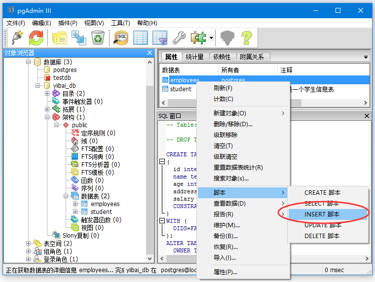 选择表“employees”,右键单击。将看到一个选项脚本,将光标移动到脚本上,将看到“insert脚本”选项。点击会得到一个这样的页面:
