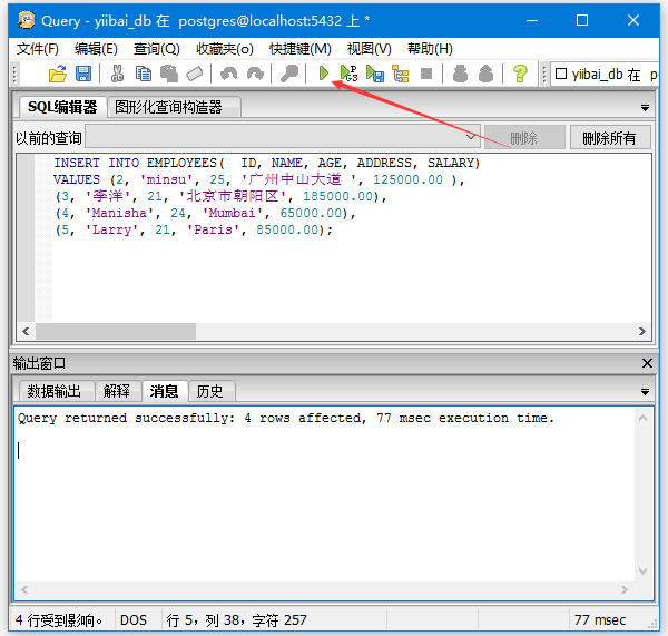 将上面的插入语句放到查询编辑器中,执行后如下图所示 -