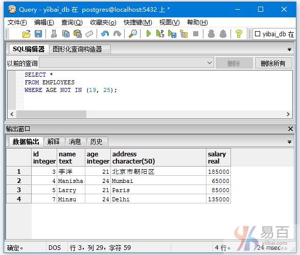 postgresql not in条件与where子句一起使用,以从指定条件否定in条件的表中获取数据。