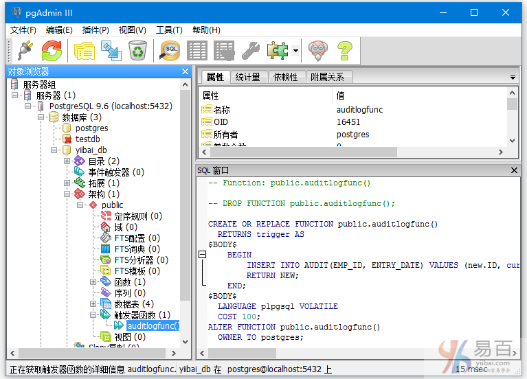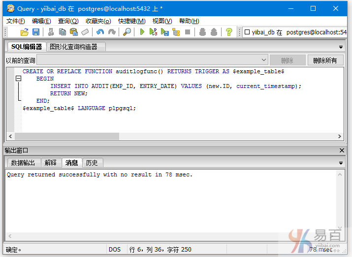 在company表上创建触发器之前,首先创建一个名为auditlogfunc()的函数/过程。