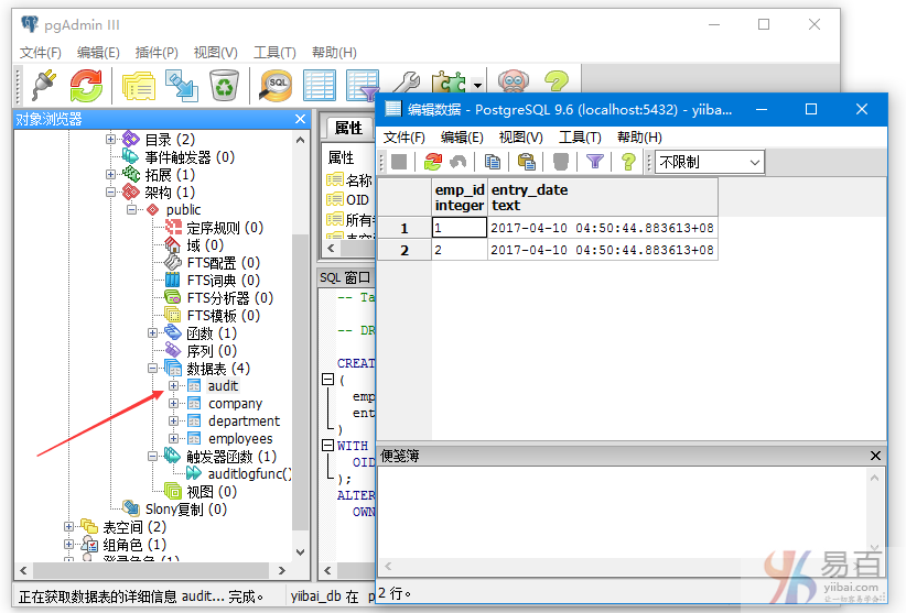 可以确定的是在插入数据后触发了触发器,postgresql也自动向audit表中创建/插入两个记录。 这些记录是触发的结果,这是因为我们在after insert on company表上创建了这些记录。