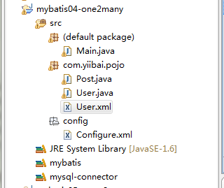 在这一章节中,要用到的配置文件有两个,一个是 mybatis 的主配置文件:src/config/configure.xml 和 user.java对应的配置文件 user.xml,我们先来看看 src/config/configure.xml,其详细配置信息如下: